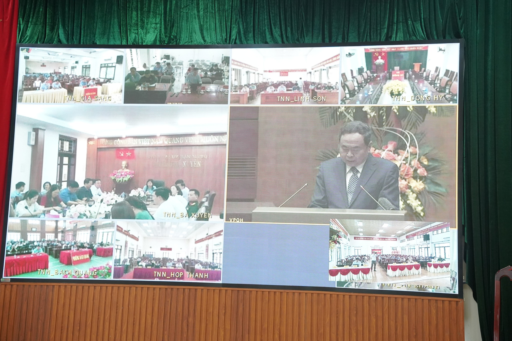 Tham dự hội nghị tại điểm cầu Nhà Quốc hội có các đồng chí: Tổng Bí thư Tô Lâm; Chủ tịch nước Lương Cường; Thủ tướng Chính phủ Phạm Minh Chính; Ủy viên Bộ Chính trị, Chủ tịch Quốc hội Trần Thanh Mẫn - Chủ tịch Hội đồng Bầu cử quốc gia; Ủy viên Bộ Chính trị, Thường trực Ban Bí thư Trần Cẩm Tú; Ủy viên Bộ Chính trị, Phó Chủ tịch Thường trực Quốc hội, Phó Chủ tịch Thường trực Hội đồng Bầu cử quốc gia Đỗ Văn Chiến.