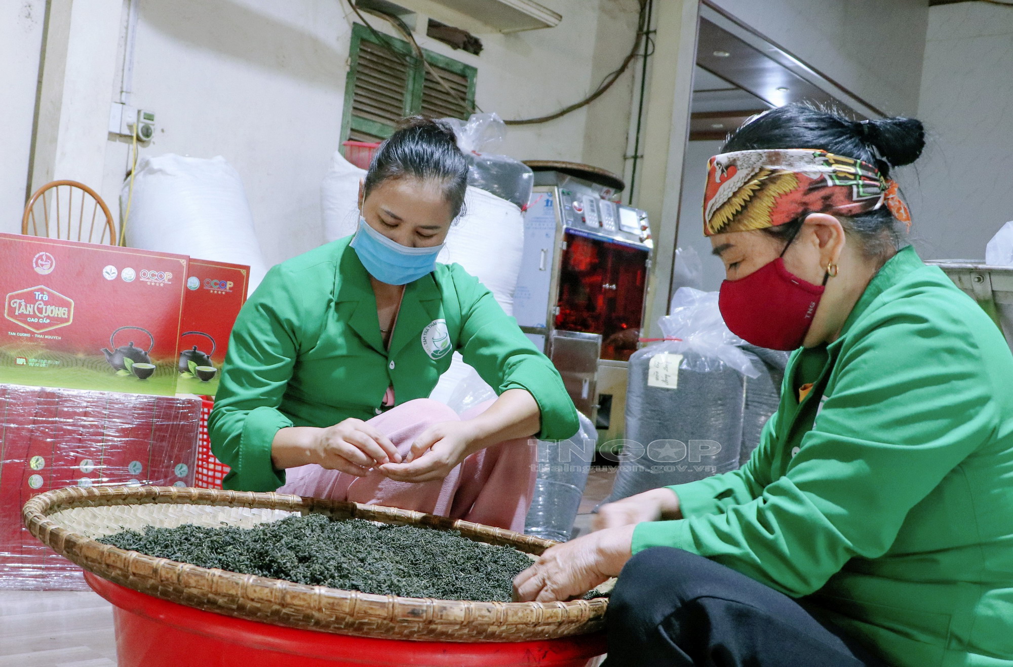 Công đoạn thu hái chè tại vườn chè của HTX Tâm Trà Thái, xã Tân Cương,TP. Thái Nguyên